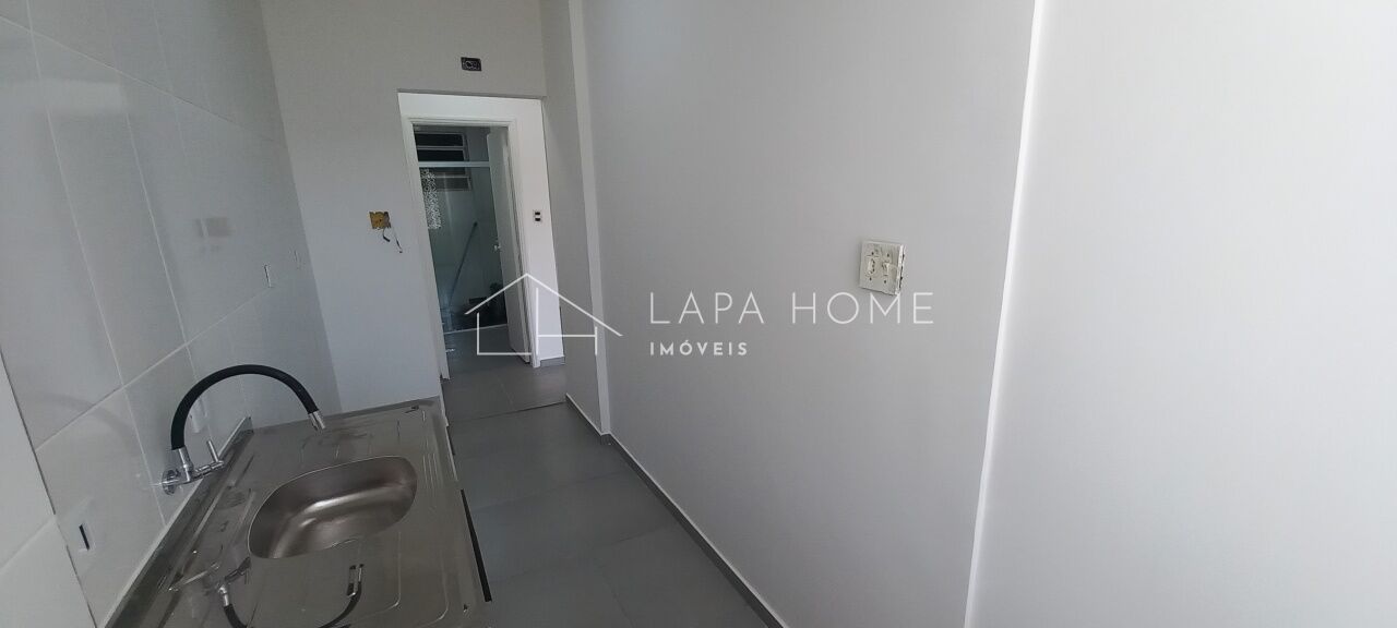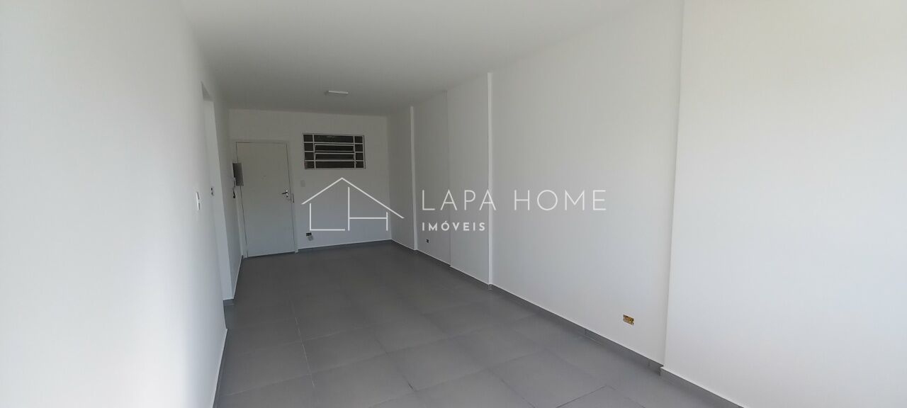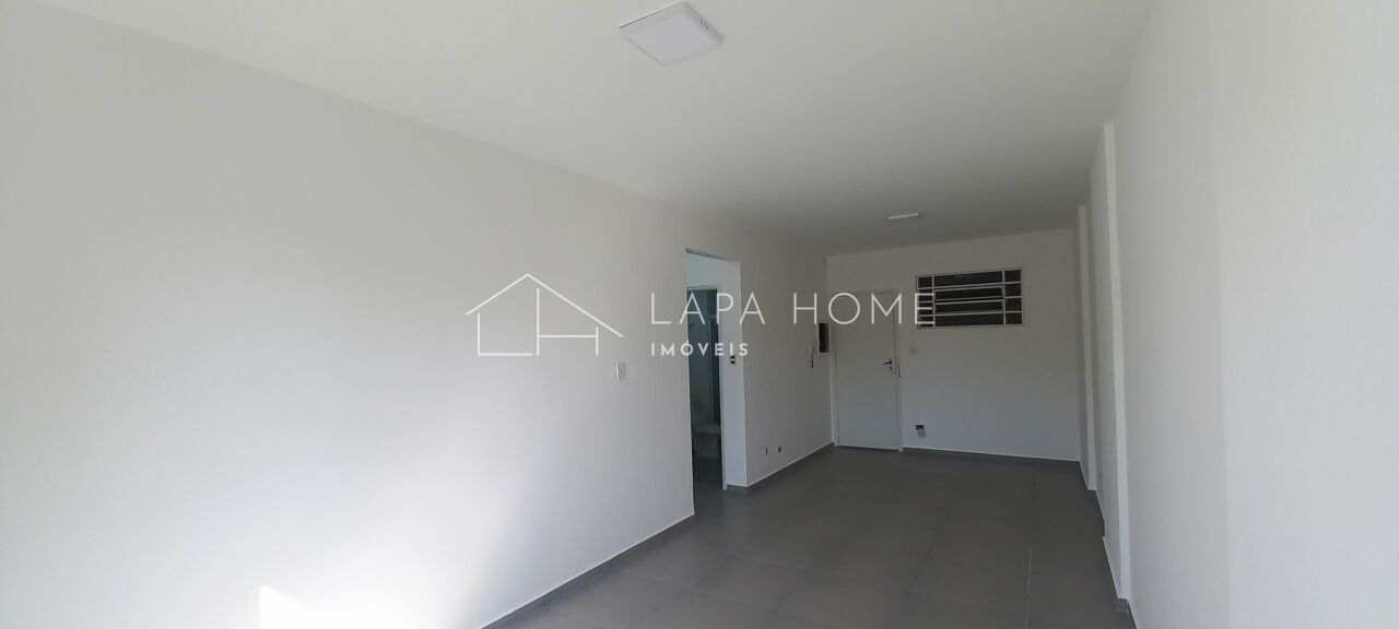 Imóvel recém reformado, com piso, azulejos, gabinetes e box de vidro novos. O apartamento tem 49 m² divididos em cozinha, área de serviço, sala e dormitório integrados e banheiro, ambiente bem arejado, com boa iluminação natural. O prédio está sendo renovado e conta com portaria 24 horas, hall de entrada, portão e três elevadores.